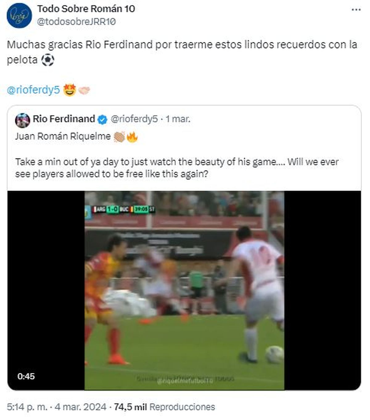Un curioso intercambio se dio a través de las redes sociales y captó las miradas de todos los futboleros. Rio Ferdinand, exjugador del Manchester United, compartió en su cuenta de Twitter un video resaltando algunos lujos de Juan Román Riquelme, y cuando el presidente de Boca le respondió agradeciendo, la leyenda del fútbol inglés lo calificó como "GOAT" (Greatest of All Time, el mejor de todos los tiempos).